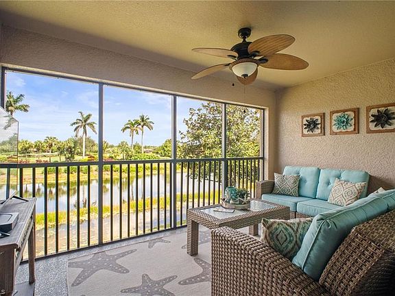 Enjoy gorgeous sunrise water and golf views from your back lanai in this top floor, FULLY RENOVATED "Coastal Contemporary" themed Veranda condo at Heritage Bay, Naples' premier bundled golf community. Golf membership is INCLUDED, and no detail has been spared, with upgrades including: NEW A/C 2024; kitchen & both bathrooms updated with white cabinets & "Ocean Beige" quartz countertops; matching Whirlpool kitchen appliances & Maytag washer and dryer; hurricane IMPACT glass and sliders throughout. Offered fully TURNKEY & move in ready, with high quality furnishings from Lazyboy, Matter Brothers, and Hammary. The "Barrington" model features 2 beds + den, 2 baths, a screened front + back lanai, and a one-car garage, and this one is located extremely close to the clubhouse (less than 1/3 mi!) and all of the resort-style amenities, restaurants, and sports! Heritage Bay features a stunning 27-hole Lewis-Azinger designed golf course and aqua driving range. The grand clubhouse offers diverse dining options, elegant event spaces, and a lively social scene. Have a bite to eat in The Grille Room— a casual indoor/outdoor bar & dining area, with an incredible southern view of the 27th green. Members can also enjoy a resort-style pool area with heated spa & 'The Cabana' poolside bar & grille with a full service kitchen. The community also includes a top-notch tennis program with 7 har-tru clay courts, pickleball & bocce courts, and a state-of-the-art fitness center. With a calendar full of events and activities, Heritage Bay ensures a vibrant and luxurious lifestyle for its members. Whether you're a golf enthusiast or simply looking for serene views and luxury living, Heritage Bay offers it all!