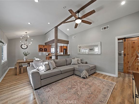 The moment you step inside, you’re greeted by the charm of wood beams and vaulted ceilings that bring richness and warmth to the open living space. The living room flows naturally into the dining area and kitchen, creating an easy layout that feels both functional and welcoming. Recessed lighting throughout the home adds a soft, modern touch and enhances the inviting atmosphere. A central hallway leads to three bedrooms, two updated bathrooms, and direct access to the finished garage.