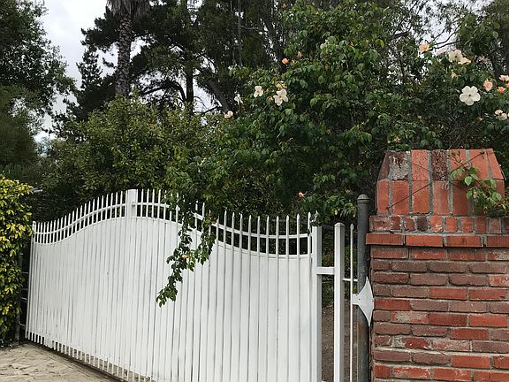 Enter through a double-wide solid entry gate, revealing a charming country cottage. A classic white picket fence surrounds the inviting brick entry courtyard and a lush perennial garden.