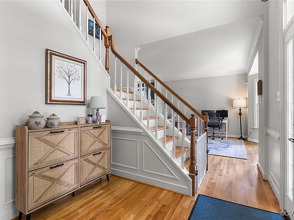 This is a must see wonderfully maintained home on a quiet cul-de-sac in the highly sought after Kings Charter community! Featuring new premium vinyl siding & dimensional roof installed in 2023, newly painted main level & new HVAC, this home is truly move-in ready for its new owners. The vaulted foyer begins w/true hardwoods & 9ft ceilings that run throughout the level. The brightly lit spacious living room w/crown molding leads to a formal dining room w/white wainscotting overlooking the back yard. The bright family room has a fireplace & direct access to a renovated deck. The kitchen comes w/granite, island seating, stainless, pantry & eat-in w/bay window. The upstairs primary has an updated bath & long custom WIC. Three more bedrooms, full bath & 2nd level laundry finish the floor. A 3rd level offers perfect office/gym/playroom flexibility & floored walk-in attic storage space. The 2-car garage provides more additional storage shelving & leads outside to the fenced-in yard space for little ones & pets & entertaining. Kings Charter has incredible amenities, community events & wonderful proximity to shopping, dining & interstates for quick commuting. Come see this home today!