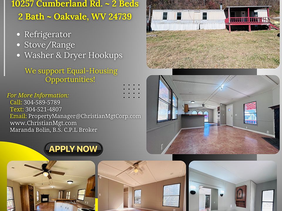 10257 Cumberland Rd. ~ 2 Beds 2 Bath ~ Oakvale, WV 24739 LEASE OPTION (Path to Home Ownership): Initial payment: $1,500 with no payments due until the 1st of the following month! Monthly payment: $795/month. No utilities included. or RENTAL: Security Deposit: $795. Can be made in payments if needed. Monthly payment: $795/month. No utilities included. Sorry, this home is not HUD approved. Private 2 bedroom, 2 full bathroom, single mobile home with TWO storage buildings! Available for rent or our Path to Home Ownership program. Beautiful, private in the town of Oakvale, WV! Monthly rent includes land & home rent. Master bedroom has attached master bathroom with large garden bathtub & walk in closet. Covered front porch for entertaining. Furnished with refrigerator & stove. Separate laundry room with washer & dryer hookup! Move in today. Christian Management Corporation Office Hours: Monday, Wednesday and Friday from 9:00AM-5:00PM & the first Saturday of every month from 10:00AM-2:00PM We will be closed to the public every Tuesday and Thursday. You can view THIS property 7 days a week! Most pets welcome with a $300.00 pet fee per pet and signed pet agreement. Maximum 2 pets. No aggressive breeds due to insurance restrictions. Clean, safe, quiet, crime & drug-free are our priorities for our residents! We support Equal-Housing Opportunities! Good people with good, bad, low, or no credit but stable employment or Social Security are welcome. -MUST pass background check -NO evictions in the last 7 years -NO sex offenders Is this property not what you are looking for? View our other available #homes, #mobilehomes, #apartments, and more on our Facebook or our website!