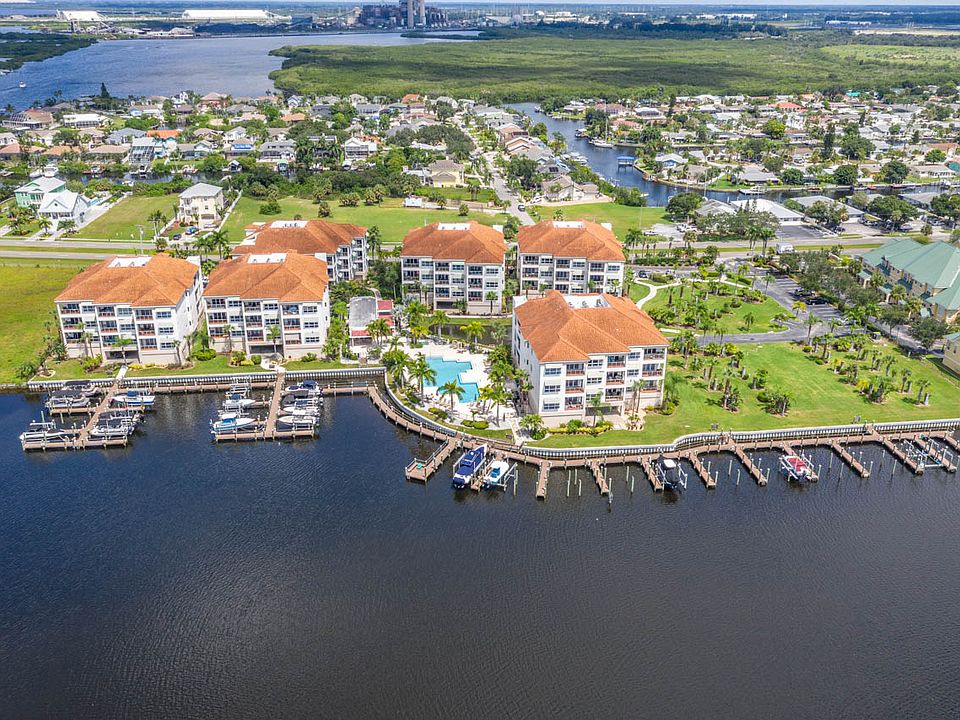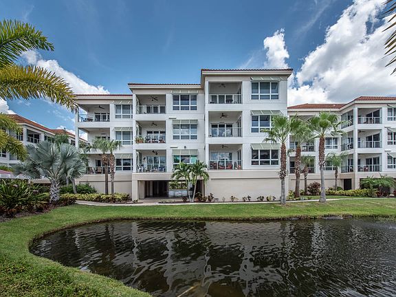 Sunsets and spectacular views from this rarely available 3rd floor end unit at Bella Sol Waterfront Villas located on beautiful Bal Harbour in Apollo Beach. This 2237 square foot, 4 bedroom, 3 bath, one story condominium was completed in 2015 and purchased in 2017 following builder auction well below market value. Adjacent property was purchased 2019 with parking spaces for owners and guests and green space for walking your pet. Features include hurricane high impact windows and sliders, motorized Silhouette shades and SunSetter EasyShade solar powered exterior sunshades that allow a full view of the pool, fountain and harbor. The kitchen has Cherry cabinets with soft-close feature, plenty of drawers and granite countertops, top of the line GE profile appliances including a Wi-Fi enabled stove with convection oven. Master bath has a huge walk-in shower, dual sinks and granite counter with vanity between, bidet, spacious linen and walk in closet. Tray ceilings in the master bedroom and dining room, crown molding, tall baseboards, beautiful door trim around the 8-foot doors, tiled entryway and balcony, mahogany front door and more. Extra large 580 square foot 2 car garage with keyless entry, 2 remotes and 4 large ceiling storage SafeRack. Amenities include gated entry, resort-style pool, hot tub, clubhouse, fitness center, community dock, all within beautifully landscaped. Although this unit does not come with a deeded boat slip there are 24' to 42' boat slips available to rent or chandelier does not convey