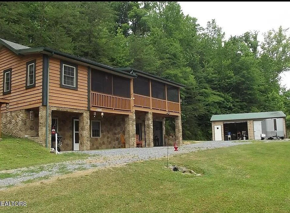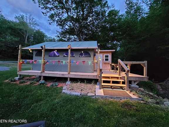 This rare property offers both a beautiful home and an established, income-producing campground. Nestled on 1.8 acres along Trail Fork Creek, it blends a Smoky Mountains lifestyle with built-in business potential. The two-bedroom, two-bath home, built in 2008 with 1,729 square feet, features a spacious kitchen with cathedral ceiling and water filtration, French doors, and a screened 6x40 deck overlooking the garden and creek. Additional amenities include a 600-square-foot two-stall workshop, a 10x25 greenhouse, a 10x25 chicken coop with covered run, garden with water and electric, wraparound drive, attached garage, and camera system.