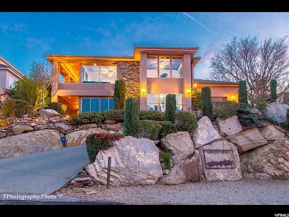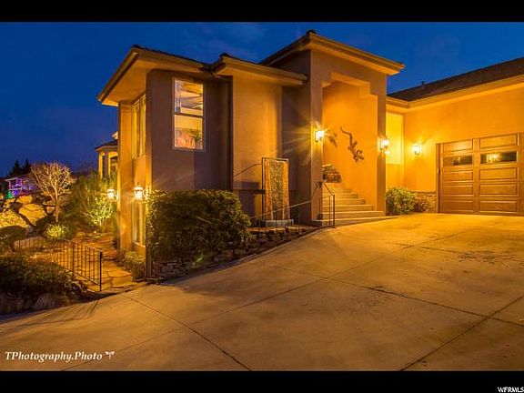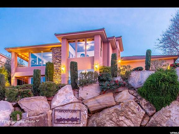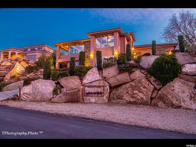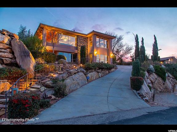 Shows like NEW! Custom built home. Phenomenal 180 views of St George. Large gourmet kitchen with backsplash travertine, under cabinet lighting and upgraded appliance package. Porcelain wood grain tile thru-out. Fireplace rock surround. Beautiful yard with waterfall, 3 covered patios, and 1 covered deck. See documents in this listing for a list of upgrades done that total up to $68,000!