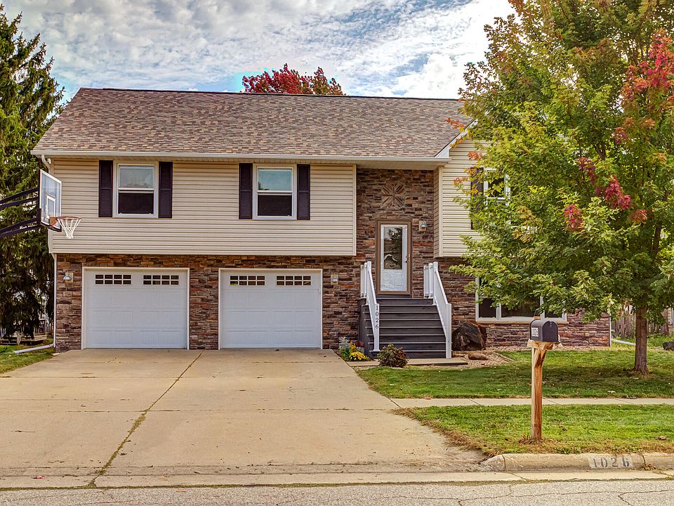 split-level residence seamlessly blends rustic charm with contemporary convenience across approximately 2500 sq ft of meticulously finished living space. Starts with a composite front porch. The upper level captivates with its open floor plan showcasing reclaimed Iowa barn wood and stacked stone accents beneath soaring vaulted ceilings. Entertain effortlessly in the updated kitchen, featuring premium hickory cabinets, quartz countertops, and an intuitive workflow design. Retreat to the spacious master suite with its ensuite bathroom and expansive closet, while two additional bedrooms provide ample space for family or guests. The versatile playroom/office offers endless possibilities to match your lifestyle. Below, the WALK OUT lower level presents a welcoming family room and 3/4 bathroom, with direct access to the partially covered back porch pre-wired for your hot tub oasis. Additional amenities include a heated two-car garage with workshop space, FENCED backyard perfect for children and pets, and brand-new roof and gutters installed in 2024.