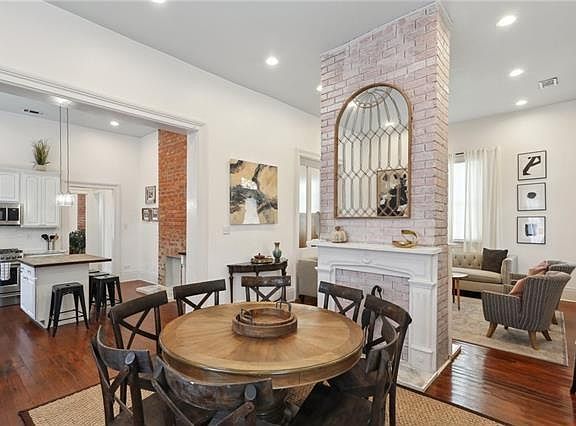 Step up the decorative brick front steps framed by quintessential shutters and into a home that’s both historic and inviting. Inside, you’ll find original wood floors, decorative brick fireplaces — including a stunning centerpiece that separates the living and dining rooms, and all the architectural details that tell a story at every turn.