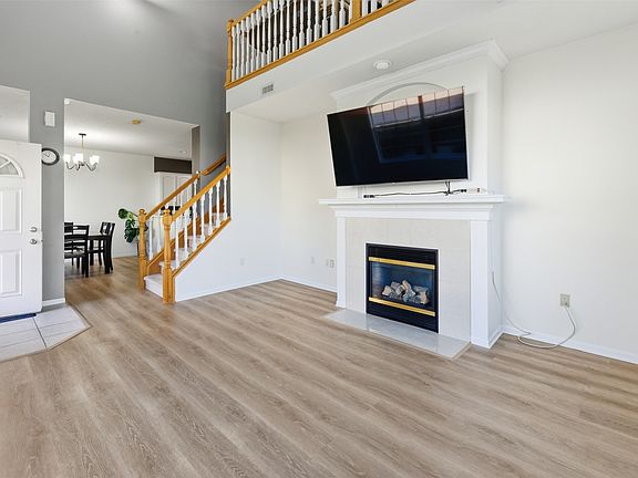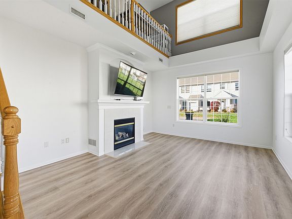 Cozy fireplaceBright open floor planCorner-unit townhomeTall windowsDesigner accent wallPrivate patioRefinished cabinets