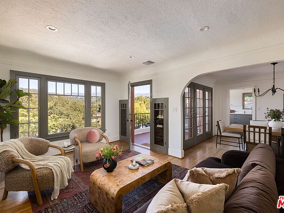 Perched gracefully on a hilltop where Eagle Rock meets Highland Park, this 1925 Spanish Revival blends timeless architecture with effortless SoCal living - a home where light, structure, and landscape are perfectly in sync, each enhancing the other as the day unfolds. Inside, the architecture is pure poetry of the era: vintage casement windows in the living and dining rooms frame expansive views of the San Gabriel Mountains; coved ceilings and an exquisite Batchelder fireplace define the heart of the home. Original refinished hardwood floors and arched passageways draw the eye from one airy space to the next, while French doors open wide to invite in hillside breezes. Upstairs, two bedrooms - both potential primary suites - offer distinct moods. One opens through French doors to overlook the terraced garden and a century-old oak; the other features a generous built-out closet and an ensuite powder room. Two baths share the level: one an authentic vintage space with a bay window and hand-painted Spanish tile, the other a tranquil ensuite retreat. The terraced backyard unfolds like an artist's landscape - featuring native succulents, a raised planting bed of herbs, and bougainvillea rest under the expansive canopy of a native coastal oak tree. Additionally, nestled off the outside patio is a petite, separate casita with Arroyo stone accents and French doors - the perfect painter's studio, office, or meditation space. Below, the lower level expands the home's versatility: an inviting living area with a relaxed Joshua Tree vibe, complete with its own bath and private entry - ideal as a guest suite, creative retreat, or in-law apartment. Close to Eagle Rock's family-friendly favorites, culturally and creatively rich Highland Park, and Pasadena's historical charm - this is classic Spanish architecture reimagined for easy, elevated California living.