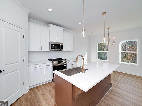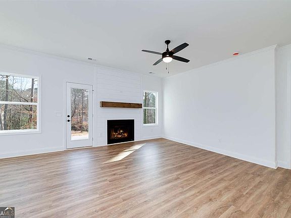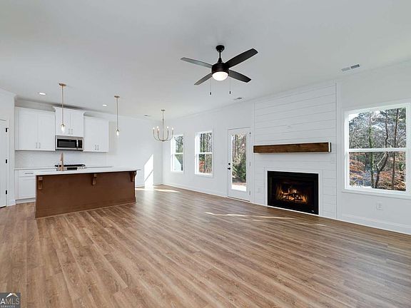 Welcome to the Copeland Plan, a beautifully crafted new construction home ideally located on a quiet road near the heart of Cumming, just minutes from Lake Lanier, shopping, dining, and everyday conveniences. This thoughtfully designed home offers 4 bedrooms, 2.5 bathrooms, and a highly desirable primary suite on the main level, blending functionality with modern comfort. The main level features an open, inviting layout with a fireplace in the great room, luxury vinyl plank flooring throughout, and a convenient half bath for guests. The kitchen is finished with soft-close cabinetry, quartz countertops, stainless steel appliances, and a gas range, making it both stylish and highly functional for daily living and entertaining. The oversized owner's suite serves as a private retreat, highlighted by a large walk-in shower with frameless glass and spa-like finishes. Upstairs, you'll find spacious secondary bedrooms, including one bedroom with its own en suite bathroom, ideal for guests, teens, or multi-generational living. Situated on a large, flat backyard, the lot offers excellent usability and flexibility for outdoor living, play, or future enhancements. The exterior is fully wrapped in James Hardie cement board siding, providing long-term durability and virtually maintenance-free ownership. With its prime location near Lake Lanier, quiet setting, and well-appointed finishes, this home delivers the perfect combination of convenience, quality construction, and modern design in one of Cumming's most sought-after areas.