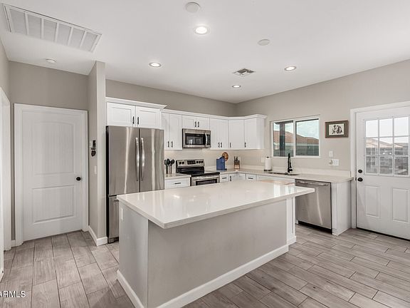 Incredible OPPORTUNITY on this MOVE IN READY home!! Take advantage of LOWER utility bills with SOLAR Panels! This Beautifully Upgraded Home offers both style and convenience. A FULLY Fenced Block Yard with RV Gate provides Privacy, Convenient Access & Storage! The Gourmet Kitchen is a true Showstopper featuring Elegant White Slow-close Cabinetry with Crown Molding and Custom Hardware, Gleaming Granite Countertops, an Oversized Island with Bar Seating, Stainless Steel Appliances, and a Designer Faucet. Enjoy meals in the sunlit Bay-window Dining area. The Luxurious Primary suite boasts a Dual-sink Vanity, Makeup area, and a Fully tiled Custom Shower. Bathrooms are enhanced with Upscale Fixtures and Cabinetry. Throughout the home, you'll find rich Wood-look Tile Flooring, Upgraded Doors, Recessed lighting, 4' baseboards, and Modern Ceiling fans. The finished 2-Car Garage includes Epoxy Flooring. Step outside to a spacious backyard with a block fence, RV gate, and an Extended Covered Patioperfect for entertaining. Nestled in a welcoming neighborhood just moments from dining, and shopping!