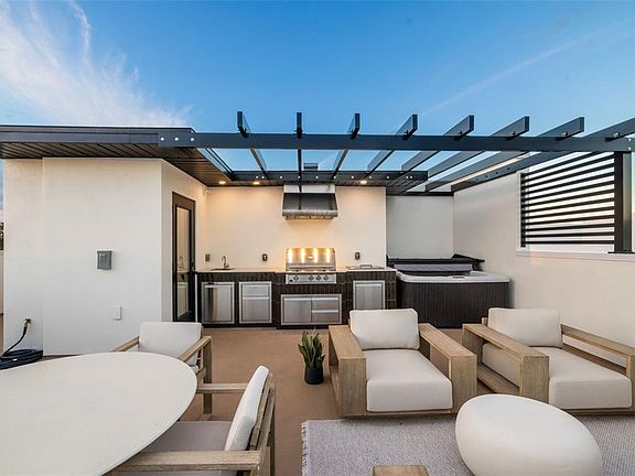 Outdoor kitchenPrivate rooftop terraceExquisite calacatta quartz countertopsBluetooth speakersCustom pergolaAmbient led lightingLush landscaping