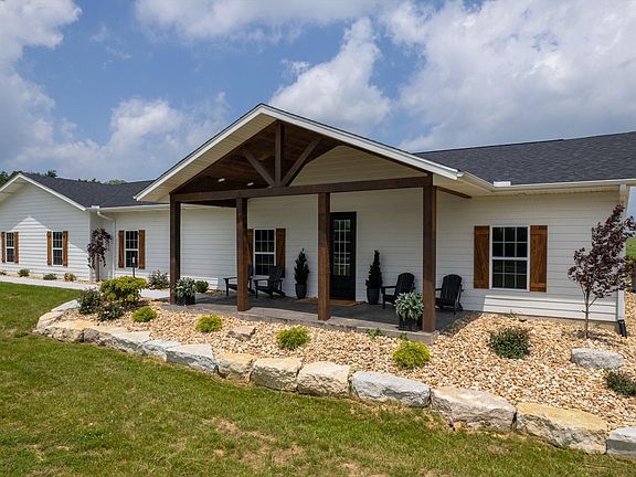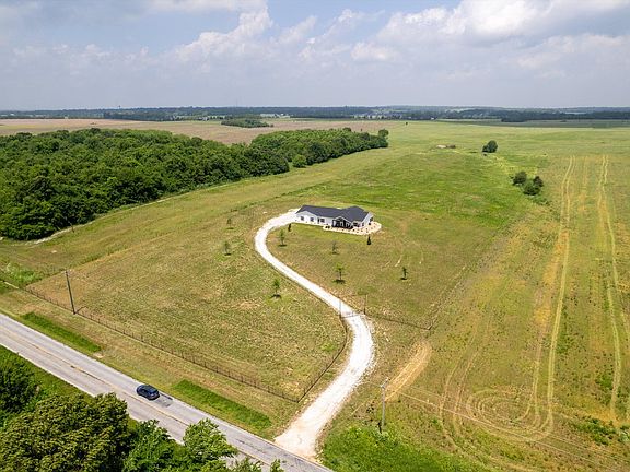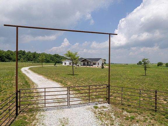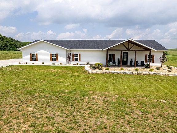 This stunning new custom home in the Clever School District is a rare find! Situated on 10.5 acres of cleared land in Christian County between Billings and Clever on Hwy 14, it offers the perfect blend of space, privacy, and modern amenities. The home's exterior is beautifully designed with large wooden beams and posts on the covered front porch and a large covered concrete back patio with a wood plank ceiling, large wooden beams, ample lighting, and a ceiling fan. There's also a large concrete pad in front of the oversized garage and a perimeter fence with a custom archway and gated entry completing the picture. Inside you'll be greeted by custom features including a gas fireplace with a striking stone surround and weathered wood mantle, stained concrete floors, high ceilings, and abundant windows that showcase the surrounding views. The magazine-worthy kitchen boasts tile flooring, custom cabinets, granite countertops, double wall ovens, a stone backsplash, a hammered copper sink, accent lighting, and a butcher block topped island with a gas cooktop and a rustic range hood.The spacious master suite features carpet flooring, a wood covered accent wall and ceiling, and a sliding barn stall style door leading into the luxurious master bath. The master bath includes a freestanding soaking tub, a large walk-in tile/stone shower with three shower heads and a bench, a large walk-in closet, and a dual sink vanity. The remaining three bedrooms all feature large closets, carpet flooring, and high ceilings. A shared bathroom with dual vanities and a study area connect two of the bedrooms. Just off the kitchen, you'll find a walk-in pantry with ample shelving and a mudroom with washer/dryer hookups and an extra sink with additional counter space. The oversized three-car garage is heated and cooled by a mini-split system. The home also has two water heaters and an electric central heat system with a backup propane setting for extreme cold. This property is truly a must see!