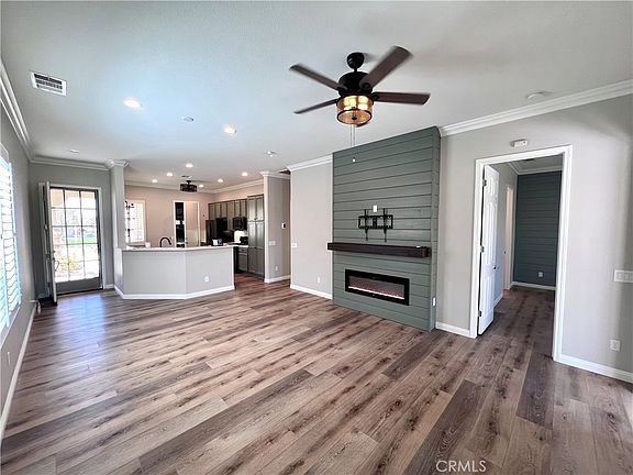 Back on the market for no fault of the sellers. A must see property in the highly desirable 55+ Golf Course Community of Solera Sun City. This home features 2 bedrooms, both with walk-in closets, 2 full bathrooms, beautiful hardwood flooring throughout, attached 2 car garage and a spacious eat-in kitchen, with additional bar seating, which opens into the living room, prefect for entertaining. The living room features an electric custom fireplace and large windows that offer tons of natural light and lead you out to your beautiful back yard. This home offers countless upgrades from custom cabinetry with plenty of storage, crown molding throughout, black stainless steel appliances, dual pain windows with plantation shutters, wood plank accent walls in both the primary bedroom and living room, a top of the line solar system and a low maintenance backyard with artificial grass, a large covered patio, gorgeous water feature and fire pit perfect for outdoor dining or just relaxing with a glass of wine after a long day of golf.