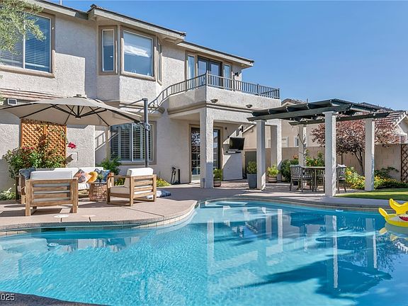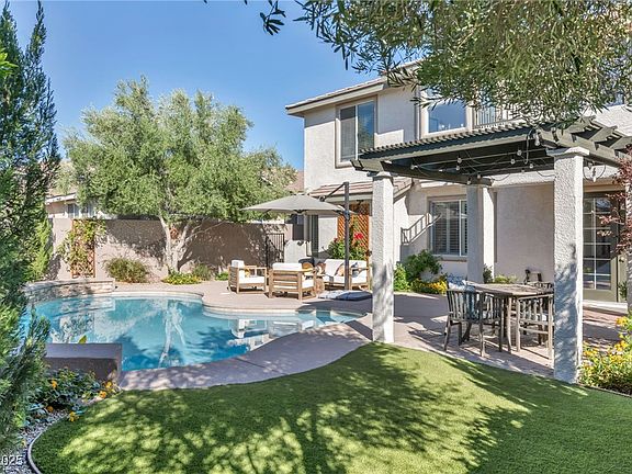 An incredible opportunity to own an exclusive property in Summerlin’s Ivy Glen neighborhood. The 2,513 square foot two-story home features three bedrooms and three bathrooms. It has formal dining, a living room, a great room, a gourmet kitchen, and a meticulously manicured exterior with resort-style amenities. The property boasts a stylish front porch, sophisticated architectural elements, and luxury vinyl and porcelain tile flooring. A central island with granite countertops presents a strong focal point in the kitchen, complete with a breakfast bar, butler’s pantry, and stainless-steel appliances. The upper-level primary overlooks the tranquil backyard from a private balcony. Its elegant bath features double vanities with a make-up area, soaking tub, and walk-in shower. Several conversation areas around the sparkling pool make entertaining easy. Community residents enjoy a clubhouse with a pool, basketball and tennis courts, BBQ area, park, and a playground.