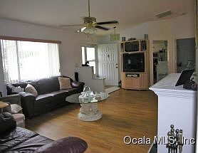 This Expanded Cardinal Model, 3/2 has spacious living area with good size kitchen featuring lots of cabinets, eat in kitchen nook area, glass top range, dishwasher, refrigerator, High cathedral ceilings; Lrg Living room, dining area; Master bedroom is also large with walk in closet, Master bath has tiled shower with grab bars; All bedrooms have laminate wood floors; screened lania with pretty stone-look tile floors, patio area for grilling, gutters,motion lights, 7 zone irrigation system; nice size garage with screened sliding doors & side entry door, washer & dryer will stay. Community offers Clubhouse, pool, fitness center with many other sports and activities.