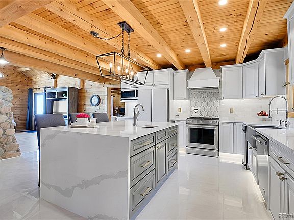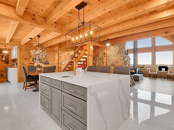 Mountain Luxury Awaits in Conifer! Discover this 5-bed, 5-bath log home on 5 private acres in Conifer Mountain. This 4,524 sq ft masterpiece blends rustic charm with modern luxury, featuring a gourmet kitchen with a quartz island, stainless appliances, and hexagonal backsplash under exposed wood beams. The open great room boasts a stone fireplace, vaulted ceilings, and stunning mountain views through expansive windows. Relax in the spa-like primary suite with a freestanding tub or enjoy movie nights in the state-of-the-art home theater. The wraparound deck and spa are perfect for soaking in city, valley, and mountain vistas. With no HOA, a durable metal roof, radiant floor heating, smart locks, and a 2-car garage with EV charger, it’s move-in ready. The fire-mitigated lot with aspens and pines is 10 minutes from Conifer’s amenities and near Staunton State Park. The septic supports 8 occupants. Just 40 minutes from Denver, this is your dream escape! Watch the video tour at https://v1tours.com/listing/57012/ and book your visit today.