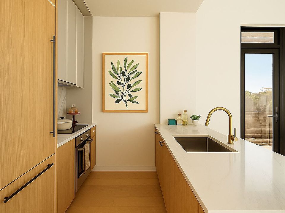 Step into this west-facing and light-filled home featuring soaring ceilings over 11 feet high, oversized triple-paned windows with screens, and wide-plank oak flooring that accentuates the light-filled open layout—creating an airy, welcoming atmosphere. The thoughtfully designed layout seamlessly connects the living and dining areas to the chef’s kitchen, a centerpiece equipped with fully integrated Bosch appliances fully integrated Bosch appliances including induction cooktop and fully vented kitchen hood, gorgeous quartz countertops with island waterfall and matching quartz backsplash, and custom designed matte gray cabinetry, ideal for the everyday chef or ultimate entertainer.