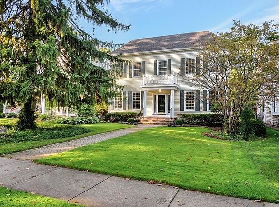 Sun filled, NOT IN FLOOD PLAIN, large scale center entry home, READY for occupancy! This is one of the best "tree" street locations, short distance to all 3 elementary schools, parks, train in town!! Expansive first floor, features beautifully detailed Living room with high ceilings that opens to library/office with custom built in file drawers & spacious formal dining room with dentil moldings at the front and hardwood floors. Large scale white kitchen opens to breakfast area w/built in cabinets, wet bar/refrigerator, family room w/blue stone fireplace & a full wall of floor to ceiling windows overlooking patio & private fenced yard. Huge mud/laundry room is off kitchen has tons of storage w/built in cabinets. On the second floor are 4 bedrooms and 3 full baths. There is a beautiful, very large scale master suite w/sitting area, 2 walk in closets, his & her sinks, separate shower and tub. Two family bedrooms share a full bath with double sinks. The 4th bedroom has an en suite bath. If you're looking for a second home office, one of the bedrooms has custom built in file drawers, which will be removed if purchaser wishes. Lower level full basement has Rec room, 5th bedroom and 4th full bath, workout room, walk in cedar closet, & large storage rm with built in shelves. This house is larger square footage than can be build today. 4500+ sq ft