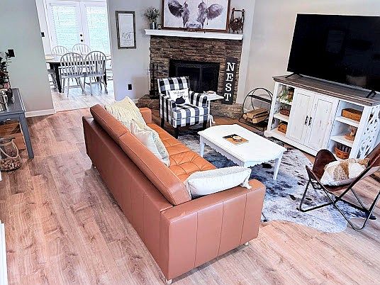 The living area has a warm, farmhouse-like feel with a large leather couch (which converts into a full-size bed), two comfy chairs, a 65-inch TV for family movie nights and a wood-burning fireplace.