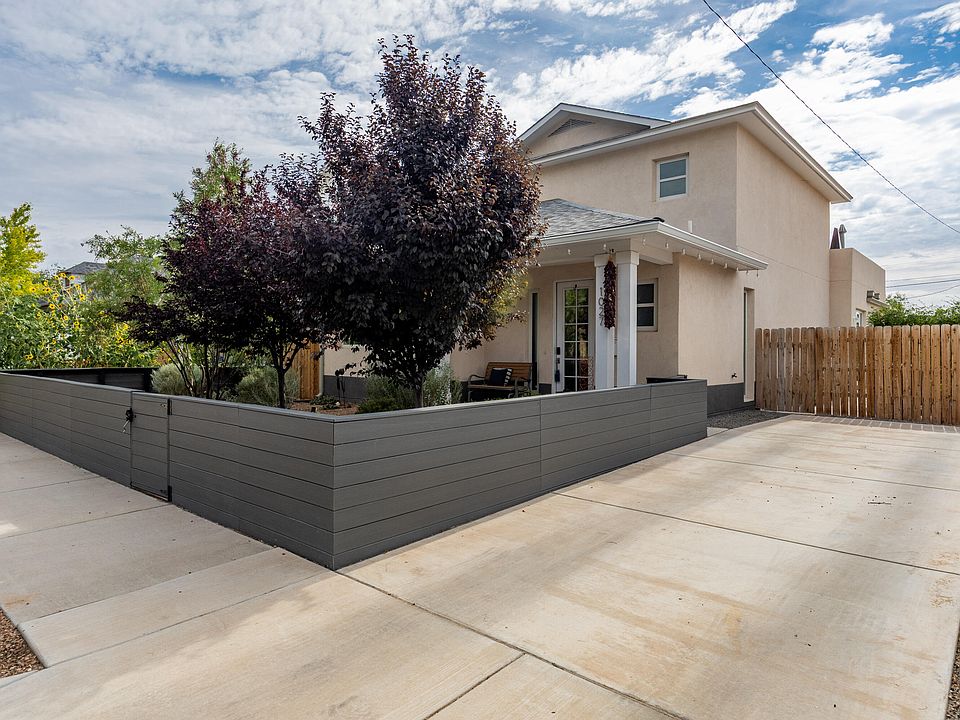 Come experience a Modern Craftsman by Paschich Design Group, built to LEED Platinum standards in a prized historic neighborhood. Polished concrete floors, a dramatic steel staircase, and large windows define the bright, open layout. The main level features a custom kitchen with Bosch appliances, a spacious living area, and a private primary suite with a spa-like bath. Upstairs, two bedrooms share a jack-and-jill bath plus a versatile loft. Enjoy energy efficiency with 6 mini-splits and a fresh air system. Outside, the property offers a serene brick courtyard, mature landscaping, garden beds, and a detached 2-car garage with alley access. Minutes to Old Town, Tiguex Park, Sawmill Market, and Downtown.