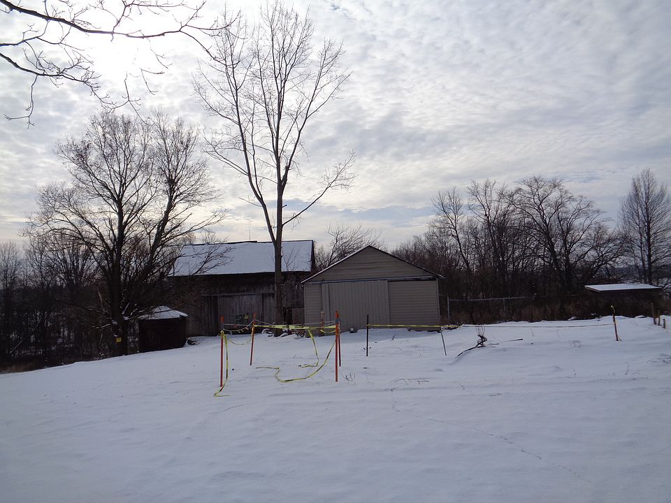 12.5 acres, hard wood trees, stream runs the south side of the land. fenced small pasture, walk out barns. 3 story barn, concrete walk out basement shell. electrical, water well, septic,