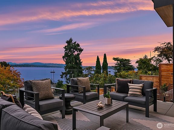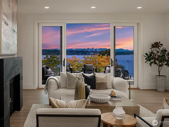 Stunning new construction with sweeping views of Lake Washington, the Cascades, and Mt. Rainier. Wrapped in warm cedar, the home centers on a view-forward great room and four patios for seamless indoor/outdoor living. The chef’s kitchen shines: a spacious marble waterfall island, Sub-Zero refridgerator, Wolf range, and elegant glass shelving. Two offices capture the panorama, and an elevator serves every level. The covered outdoor kitchen-fireplace, BBQ, refrigerator drawers, and heat lamps welcome year-round enjoyment. Six bedrooms (or five plus a second office), 4.5 baths, media room, wine cellar, designer lighting, and a Costco room w/two fridge/freezers and abundant storage. Three garages: an attached two-car plus an additional single.