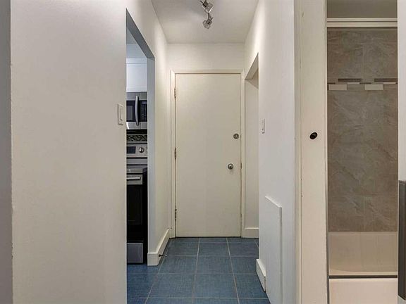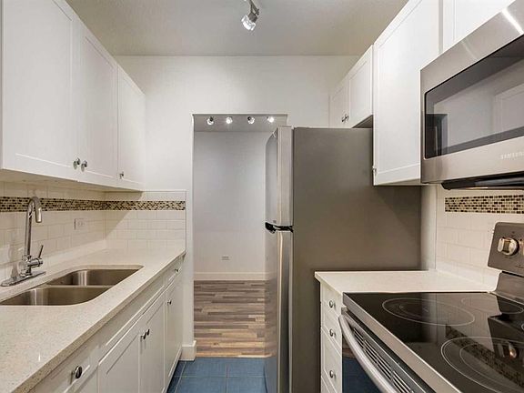 Galley-style kitchenQuartz countertopsWhite subway tile backsplashStainless steel appliancesClean bright cabinetryUpdated finishesPrivate balcony