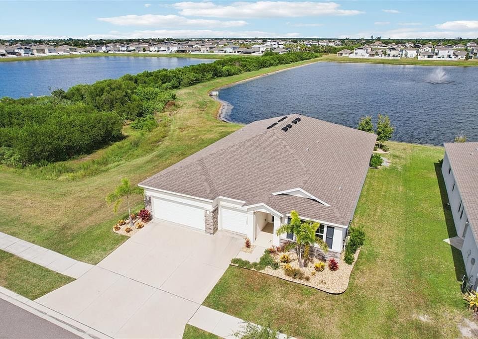 Discover this stunning 4-bedroom, 3.5-bathroom waterfront home in the desirable Shell Cove community of Ruskin. From the moment you arrive, you'll be greeted by mature landscaping and the impressive oversized 3-car garage. Step inside to an elegant, open-concept design featuring tall ceilings and ceramic tile throughout. The spacious kitchen and family room combination is perfect for entertaining, anchored by a huge island/breakfast bar, sleek dark wood cabinetry, and stainless steel appliances. A bright dinette area sits conveniently adjacent to the kitchen. The large 3-panel sliders in the main living area perfectly frame the peaceful pond views out back, bringing the serene waterfront setting into your home. The home also includes a versatile bonus room and a large, central laundry room. The thoughtful split-bedroom layout offers exceptional privacy. The primary suite is a true retreat with an en suite bathroom and a large walk-in closet. A rare find, the second bedroom also features its own en suite bathroom and walk-in closet, making it an ideal guest or in-law suite. The additional bedrooms are generously sized. Community Amenities: Enjoy the best of community living with a fantastic array of amenities, including a Clubhouse, sparkling Pool, Playground, and Dog Park. The neighborhood features Sidewalks for pleasant strolls, a convenient Community Mailbox center, and is secured by Deed Restrictions. This home is an absolute must-see for those seeking waterfront living, luxury amenities, and a vibrant community lifestyle!