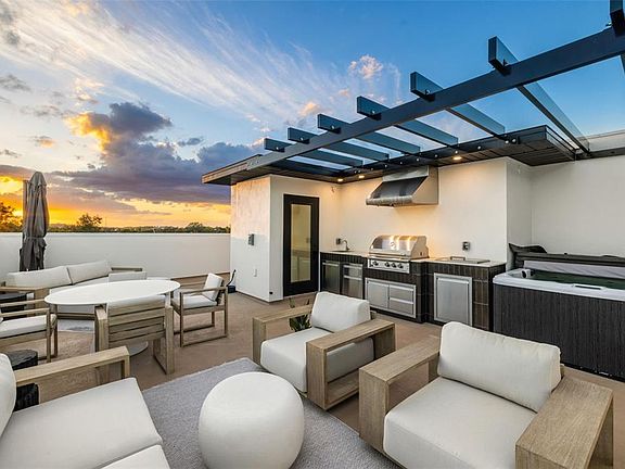 Outdoor kitchenPrivate rooftop terraceExquisite calacatta quartz countertopsCustom pergolaLush landscapingSleek samsung bespoke appliances