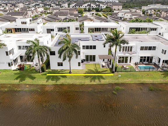 Stunning and impeccable home at the prestigious Modern Doral 75. This smart home has 6 bedrooms and 7 full bathrooms, marble and wood floors, high ceilings, impact windows, kitchen with top-of-the-line stainless steel appliances, glass and steel staircase railing, garage space for 2 cars and additional 5 parking spaces in the driveway. Great backyard waterfront to the lake with built-in BBQ, sink, and refrigerator. A significant highlight of this property is its solar panels, offering an autonomous energy source and resulting in considerable savings on electricity bills. Modern Doral is a full-service community, offering club house, fitness center, children's playground, pool, spa, gym, business community, media center and a children's room, gated community 24/7 security, MUST SEE IT!!