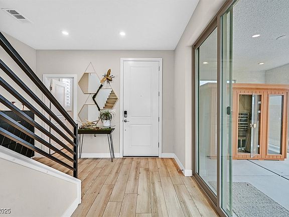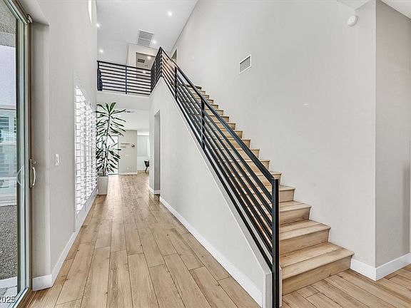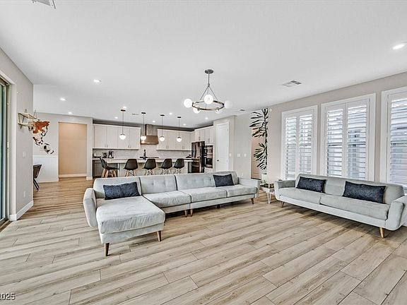 Discover luxury living in this stunning 5-bedroom, 4.5-bath modern home in the sought-after Skye Canyon community. This Pardee neighborhood has the most innovative front elevations and interiors. Designed for seamless indoor-outdoor living, this two-story masterpiece features a private downstairs bed-and-bath combo and a covered side yard retreat. Sunlight pours through oversized windows adorned with elegant poly-wood shutters, highlighting the open floor plan, soaring 9' ceilings, and designer finishes. The gourmet kitchen boasts sleek quartz countertops, two-tone cabinetry, and premium appliances. Luxury laminate flooring, a striking modern stair railing, and custom wall treatments add sophistication. The spacious 3-car tandem garage, water softener, and RO system offer both style and convenience. Step outside to a covered patio and beautifully landscaped backyard with an in-ground trampoline. Enjoy top-tier amenities, including a pool, gym, and scenic parks. This is a lifestyle.