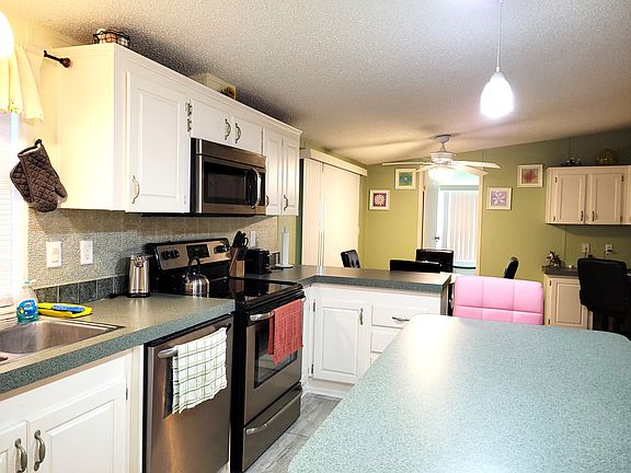 This 2006 Erica model Walden Woods, a 55+ community, is beautiful inside and out! A big kitchen with island and bar seating, a pantry, stainless steel appliances and a built in desk off of the dining space. There's a full size laundry room with an additional refrigerator and a 2nd and 3rd bedroom at the opposite end of the home from the primary suite at the front of the home. King size bed and all furniture is included. Solid surface waterfall end tall vanities in both bathrooms in this suite. Floor to ceiling tile shower on one end and another dressing area at the other end of the walk-through closet. The hall bath also boasts another low entry, floor to ceiling beautifully tiled step-in shower. Porcelain sinks, quality workmanship and tasteful decor throughout. There's lots of storage, closets and even an air conditioned enclosed lanai and separate screened in room off the carport. This furnished home leaves nothing for you to do except sit back and enjoy in our 55+ Community! Call or stop by as this is truly a MUST SEE home!