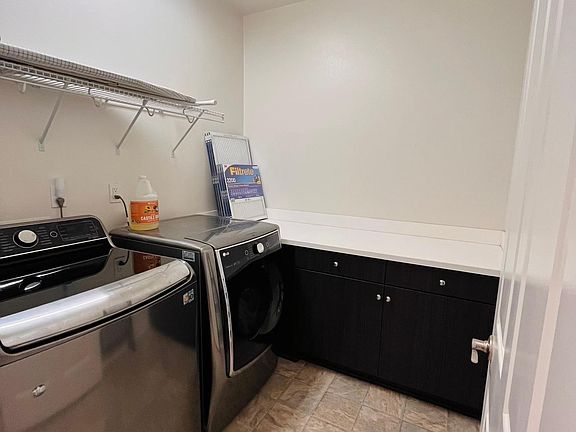 Conveniently located on the second floor is the laundry room with cabinets for storage, a good-sized countertop perfect for folding clothes fresh out the dryer.