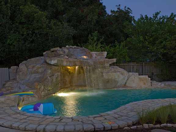 The backyard has a beautiful pool, a propane fire pit, grill, and plenty of seating area- the perfect way to spend a dreamy afternoon!