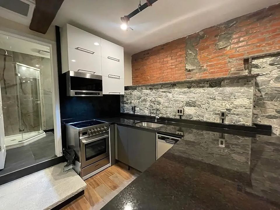 Exposed brickSmall patio areaIndustrial detailsGranite countertopsStainless steel appliancesNew cabinetsLarge windows