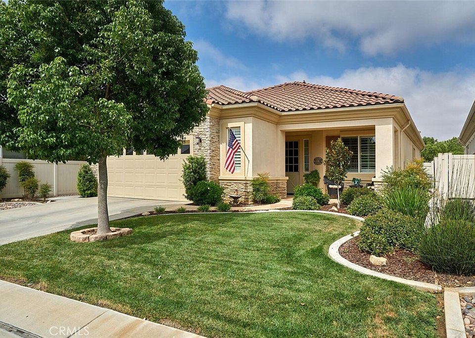 MOUNTAIN VIEWS FROM THIS GORGEOUS HOME IN SOLERA, A 55+ COMMUNITY! NEWER CENTRAL AIR/FURNACE. 2 bedrooms/2 bathrooms and and office/den.You will love this home before you even walk inside! Stone exterior and a flagstone walkway give this home great curb appeal. This is an immaculate home that has been impeccably maintained. Upgrades include plantation shutters; upgraded Berber carpet and ceramic tile; Pergo flooring in the master bedroom, guest bedroom and even the closets; built-in entertainment center; newer refrigerator, dishwasher, disposal, microwave; front screen door; fans in most rooms; glass door on guest bathtub; a workbench and overhead storage in the garage; extended covered patio; and a second gate leading to the back yard. Newer hot water tank. You will love the meticulously landscaped backyard! Solera is a guard-gated community. The clubhouse has a state-of-the-art gym with an indoor running track, billiards room, meeting rooms, bocce ball court, tennis courts and a heated pool and spa. Solera is located close to Palm Springs, golf courses, Morongo Casino and outlet malls. Basic cable TV and internet included and paid through HOA.