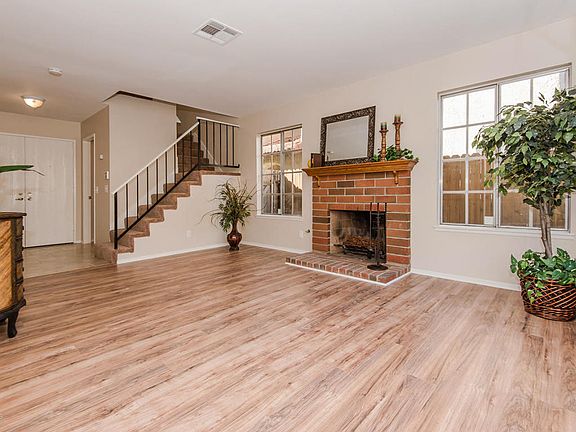 Welcome to this highly upgraded 4 bed, 2.5 bath beauty in the highly sought after Strathmore Townhome community. This home features one bedroom and a half bath downstairs, and 3 bedrooms, including the master, and 2 baths upstairs. There is brand new wood-like flooring and tile throughout the downstairs and beautiful plush new carpeting upstairs. The kitchen has been remodeled with granite countertops including breakfast bar, a new sink & faucet, a new dishwasher and oven/range, and new recessed lighting. All 3 baths also feature new granite countertops and new sinks and faucets. The home also boasts a large family room with cozy fireplace, brand new designer paint and scraped ceilings. This townhome has a beautiful large yard with patio and very low HOA dues.