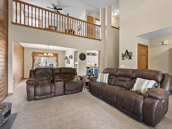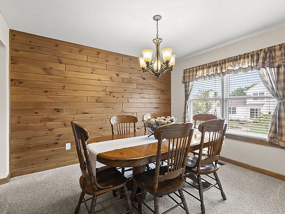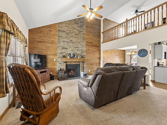 Step inside to find a warm, rustic charm in the living and dining areas, with tongue-and-groove wood siding interior accents coupled with, rich wood trim, and a floor-to-ceiling stone fireplace complete with a custom mantle and upgraded tile. Natural light pours through windows and an enhanced sliding glass door with built-in blinds, while new flooring flows seamlessly throughout—hickory hardwood, upgraded vinyl, plush carpet, and elegant tile.
