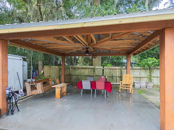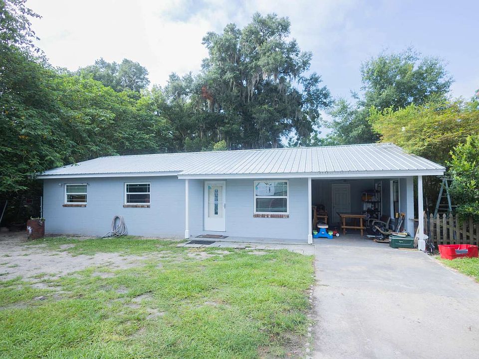 Great option right in the middle of town. This 4/2 block home has a single car carport, galley kitchen, a large 20x20 (ext dimensions) Master bedroom area, metal roof installed in approx 2019. But wait until you see the backyard, a newly poured concrete patio, walkway, and a pergola/gazebo outdoor sitting area made with Osceola pine and a large outdoor ceiling fan, all in a private back yard. Note: 1565 sf is including an approx 9’x11’ laundry room that is open to interior, but does not have its own air vent. Master bedroom also has a mini split unit to keep you extra cool.