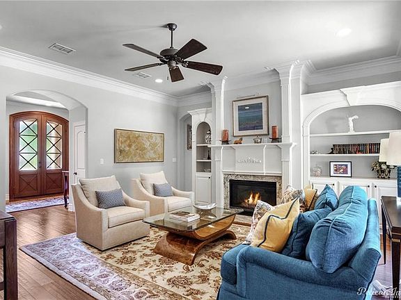 This beautiful home is ready to make memories with your family. Gleaming hardwoods and arched doorways may be found throughout the home. A brick archway leads to a formal living room with a gas fireplace flanked by built-ins. The gourmet kitchen is the heart of the home and features beautiful granite counters and stainless steel appliances. The kitchen island is perfect for preparing food while chatting with family members grabbing a snack at the breakfast bar. The cozy hearth room has a brick wood burning fireplace with a generous hearth. Remote master suite and guest bedrooms are located on the first floor. Two more bedrooms and a playroom are located on the second floor. The back patio is an enchanting retreat with brick arches and lush landscaping. It features an outdoor kitchen with a brick herringbone patterned wall, granite counters, a beverage refrigerator, a gas grill, and slate floors. The current homeowners extended the patio and added the pergola.