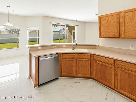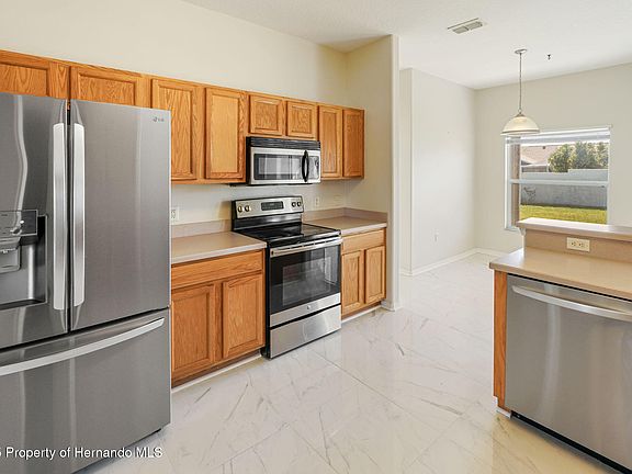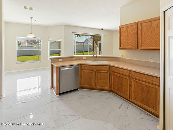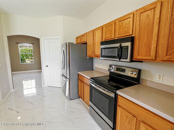 Don't miss this well maintained home in the heart of Spring Hill! Walk into the open foyer to the formal living & formal dining room great spot for entertaining and family dinners. The great room is spacious with wood look/ ceramic tile, soaring 9' ceilings, open and bright. Kitchen features oak cabinets with corian countertops, large pantry, SS appliances, dishwasher & refrigerator are one year old, large pantry. Kitchen opens to a breakfast nook cozy spot for your morning coffee. Primary bedroom is a generous size featuring tile, large walk in closet. Primary bathroom features walk in shower and luxurious garden tub. Four more bedrooms provide a lot of space for spreading out two feature carpet, one has tile. Hall bath has a tub/ shower combo and tile. There is a expansive screened lanai with a fan. The backyard is huge and partially fenced, with a sprinkler system, hurricane shutters, AC is apprx. 6 years old. No HOA, no deed restrictions. Great location close to restaurants, shopping, hospitals, Weeki Wachee River with the famous mermaids and manatees, Pine Island Beach, Crumps waterfront restaurant. Easy commute to Clearwater, Tampa & Orlando.