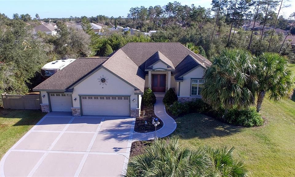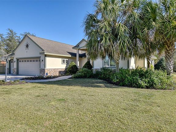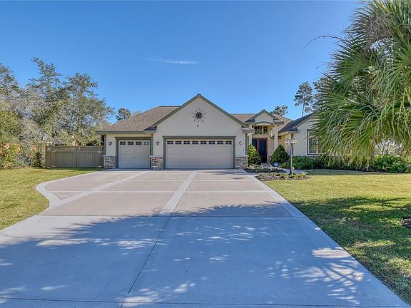 You dont want to miss this one-of-kind custom home built by the owner, former contractor in Wisconsin. 3 beds, 2 bath, split plan w/ 3 car garage on 0.47ac lot with plenty of privacy. You are welcomed through the oversized 8 front doors including handcrafted solid wood screen doors w/ upgraded hardware into a beautiful foyer w/ high arched ceiling, PCL columns & a coat closet. Upgrades galore are used throughout the home from construction to interior. Additional pressure treated 2X exterior block wall framing, vinyl casement windows, 35-year dimensional GAF roof, continuous hy-point shingle over ridge vent. The immaculate detailed 3-car garage leads to enclosed 8'x22' attic storage area access by disappearing stairway. Garage floors were painted Dec. 2021. Even the septic is an upgrade and oversized. No detail was ignored. Surrounding the rear of the property is vinyl privacy fence with interior chain link fence for dogs surrounded by plenty of lush landscaping: bamboo, crepe myrtle, sable palms, and Arizona cypress. Side stoned yard storage area for camper/trailer through 10' HOA required fence gates. You are surrounded by mature landscaping from your lanai and expanded screened in area with designer paver tiles. Just inside is the custom- built kitchen which adorns an island, solid wood cabinets w/above and under cabinet LED lighting and oversized pantry, solid surface Corian counters, trash compactor, stainless steel appliances and garbage disposal. Refrigerator and Microwave are 3 years new. Windowsills throughout are solid surface. The kitchen joins the dining room which leads into an open Living Area with beautifully crafted ceiling and a see-through double-sided fireplace shared with the lanai, electric start with LP. There is recessed lighting in the niche area. Second guest bed opens to a walk-in closet and has vaulted ceilings. Ceiling fans are in every room. Guest bath includes 5 swanstone shower base n tile, solid surface counters, and is upgraded in every detail; wood framed mirror conveys. Large master bedroom and adjoining X-large ensuite has vaulted ceilings, designer tile, double vanities w/ wood framed mirrors, separate soaker tub and open concept walk-in shower with designer tile. Two walk-in closets and an exterior door from the bedroom to the lanai, screened porch area. From the Living Area you will enter the oversized laundry room w/ a built-in ironing board closet, high end washer, dryer, bench with shoe storage, leading into the large 3-car garage. Tile is throughout with carpet in bedrooms. All major systems have been inspected annually. Windows are vinyl casement. High efficiency water heater is 5 years new. House includes a full house central vacuum system. All interior panel doors are solid wood. Fireplace and chimney serviced in 2021. Conveys: appliances: Refrigerator, Range, Trash Compactor, Washer, Dryer, Garbage disposal, Microwave, Dishwasher, TV wall mounts, curtain rods and valances in dining room, bathroom wood framed mirrors, 2nd bedroom window treatments, hot tub, wall decor in lanai. Does NOT Convey: pleated shades, cornis board and curtains in 1st guest bedroom (sage color) does not convey, master bedroom curtains and shades do not convey, umbrella in screened porch does not convey. Garage refrigerator and tractor can be sold to buyer.