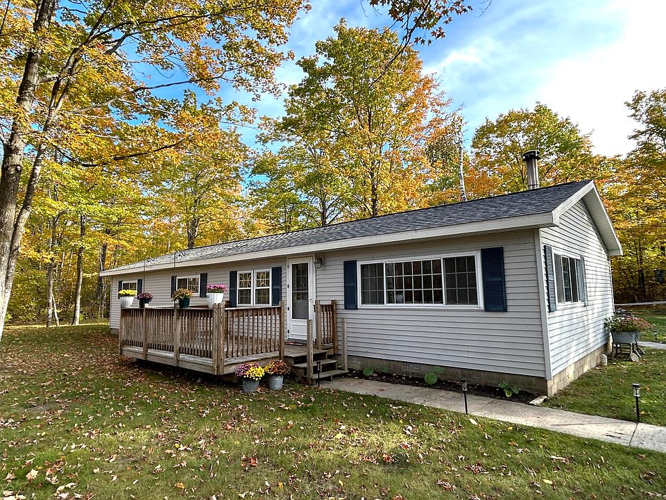 Discover the comfort and convenience of this charming ranch-style home situated on over 1.5 acres. The home features a spacious main bedroom with a private bath, a cozy wood stove for those chilly evenings, and several recent updates including a newer furnace, water heater, roof, and kitchen appliances. Outside, you'll find a 30x42 detached garage equipped with a 100-amp sub panel and a handy half bathroom, plus a 10x30 lean-to for extra storage. The yard has extra lights for evening horseshoe games and outside activities. Never leaving you in the dark. Offering both practicality and privacy, this property is perfect for those seeking a peaceful setting with plenty of room to spread out. A lot in the Presque Isle Association is included giving you clubhouse access and other amenities.