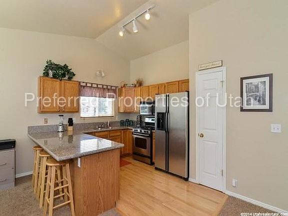 Refreshed Sandy home w exquisite views of mountains and valleys. Granite counters in kitchen, vaulted ceilings in great room w fireplace. Master bedroom opens to balcony. Lg. storage room in basement. Full grown trees in spacious, fully fenced yard w deck and patio. Easy access to Buttercup Park, Sandy Library, and Alta View Hosp.