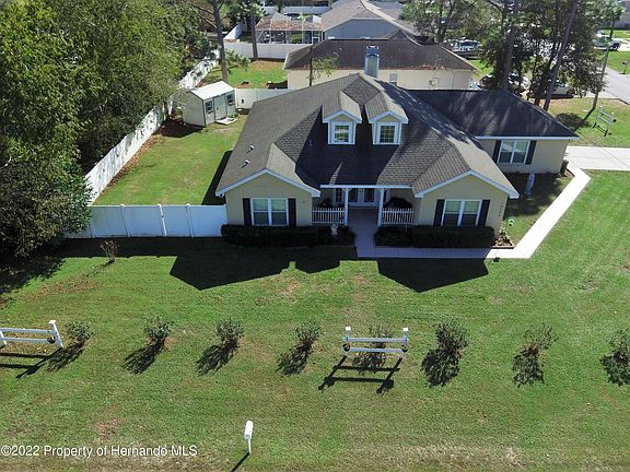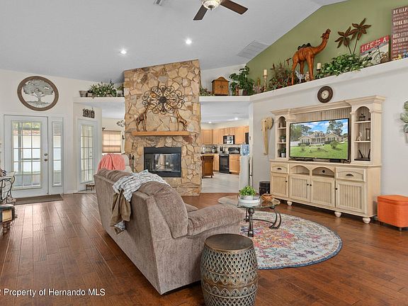 STUNNING floor-to-ceiling, double-sided, stone fireplace! This warm and inviting 2004 custom built 3 bedroom, 2 bath, 2 car garage home is situated on .3 acre corner lot with a privacy vinyl fenced yard. As you come up the walkway to the cozy front porch and enter thru the beveled glass double doors into the expansive Great Room, you'll find the unique fireplace, and an abundance of natural light from the dormers, wood flooring, cathedral ceilings and plant shelving. On the opposite side of the fireplace you'll find a spacious kitchen and dining area for those family and friend gatherings. The kitchen cabinets are plentiful, all appliances, granite countertops, laundry closet. The Dining area features a window seat, French doors provide access to the screened in rear patio. Access from Great Room thru double doors on the left lead to the generous Master Suite which encompasses the entire left side of the home and features a tray ceiling, two walk-in closets, French doors to the rear patio. The recently updated, luxurious Master Bath offers dual sinks, garden tub, separate shower, plantation shutters. This split plan features a separate hallway with pocket sliders where you'll find 2 additional bedrooms and a recently updated guest bath with tub/shower. The oversized side entry 2 car garage is immaculate. Enjoy morning coffee or evening drinks in the rear screened in patio! The spacious backyard offers plenty of room to add a pool and includes a sizable shed with electric! Granite counter tops and convenient Central Vacuum system can be found throughout the home. Energy efficient windows 2011, New epoxy floor coating in Garage, front sidewalk and porch. The 1/3 acre corner is ideal for RV, boat parking!! No HOA. Located in the heart of Spring Hill close to schools, medical, shopping and restaurants. A short 15 minute drive to Gulf of Mexico, Pine Island Beach and easy access to Tampa via Suncoast Pkwy. Schedule a showing to see this beauty today!