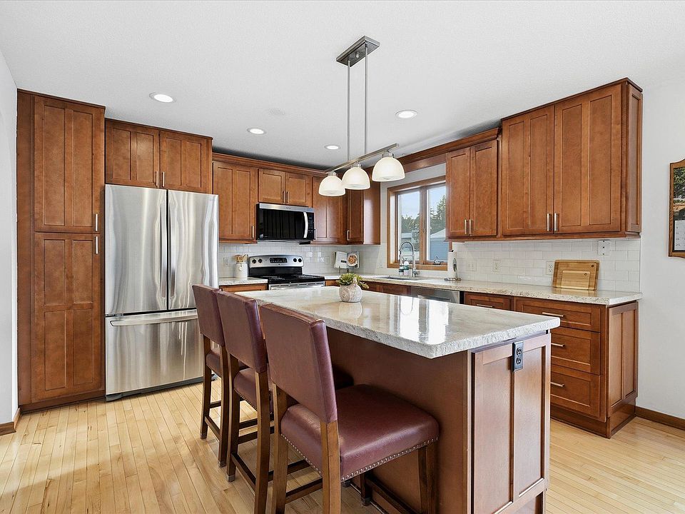 Welcome home to this beautifully updated gem in a phenomenal Shoreview location, just minutes from the community center, dining, and shopping! The stunning renovated kitchen showcases rich cherry cabinetry, stainless steel appliances, modern countertops, and maple hardwood floors that flow seamlessly through the hallway and bedrooms. Retreat to the spacious primary bedroom with a private ¾ bath, while two additional updated bathrooms offer comfort and convenience. The lower-level family room is made for entertaining, featuring a cozy gas fireplace and wet bar—perfect for game nights or gatherings with friends. A new furnace adds peace of mind, while an oversized two-stall garage provides plenty of room for storage, hobbies, and all your toys. Step outside to enjoy mature trees, peaceful backyard views, and frequent wildlife sightings. The maintenance-free exterior shines with James Hardie siding, stucco, and brick accents—offering both style and confidence!