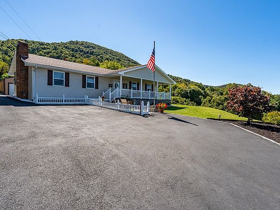 This custom built ranch with breathtaking panoramic mountain views is a must see. The home features 3 bedrooms and 2 full bathrooms, beadboard walls and hardwood flooring, a brick fireplace with gas logs, and beautiful kitchen with new countertops and appliances. Outside you will fall in love with the covered front porch overlooking the mountains.This porch is a dream spot for coffee in the morning and sunset tea in the evenings. There is also a back patio with a picnic area, a two car detached garage (20x54) with an attached workshop/bonus space and a kitchen for canning, as well as an additional storage building with a dairy. Major ticket items have been updated - roof (2018), HVAC and duct work (2022), hot water heater (6yrs), dishwasher (2022), cooktop (2022), oven (2022), sink and counters(2022) and windows (2018).