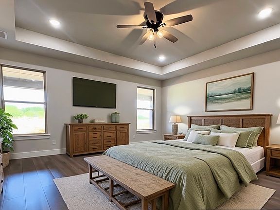 Luxurious Living Room: Cathedral ceilings, a beautiful stone fireplace, and ample space to relax or host guests. Primary Suite Retreat: Spa-like bathroom with dual vanities, a walk-in shower, an extra-large walk-in closet, and a patio. Spacious Secondary Bedrooms: Three additional bedrooms with walk-in closets, ideal for family or guests. Outdoor Living: Enjoy the serene countryside views from the covered front porch.