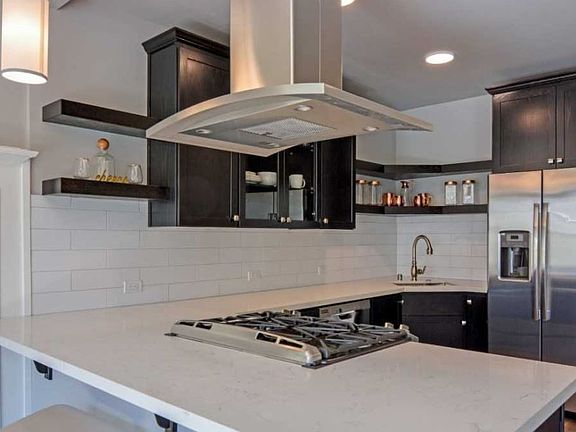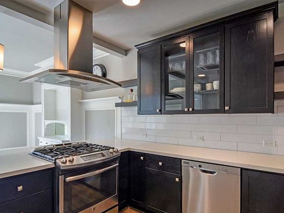 - Contemporary kitchen with stainless steel appliances (gas stove, quartz countertops, dishwasher, and refrigerator with ice maker, and filtered water dispenser)