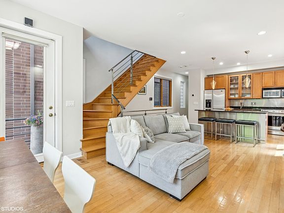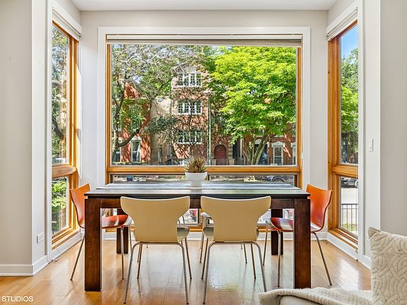 This truly unique 3 level home boasts 2 bedrooms, 2.5 bathrooms plus a bonus family room in ideal Wicker Park location. The main floor features a sun-drenched living/dining space with a huge picture window. Kitchen features shaker style cabinetry, stainless steel appliances, natural stone countertops and a walk-in pantry closet. Upstairs is a primary suite with a generously sized bedroom able to accommodate a home office nook and workout equipment, Juliette balcony, walk-in closet, and marble bathroom with dual sinks, oversized shower and separate soaking tub. Downstairs is a family room with a gas fireplace which has a walkout patio attached maximizing natural light, another bedroom and a full bathroom. The outdoor patio off of the main level is one-of a kind with an intimate mid-century modern vibe featuring curved, wood-slatted walls and ceiling. Close to restaurants, shopping, and public transportation yet tucked away on a desirable tree-lined street in Wicker Park.